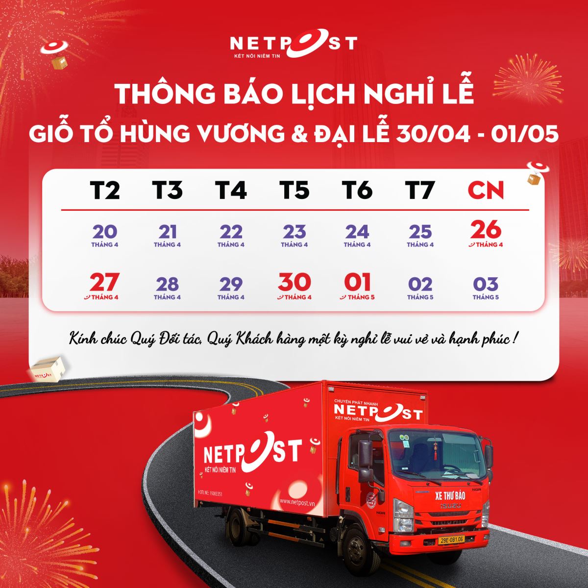 NETPOST chân thành cảm ơn sự đồng hành của Quý Khách hàng, Quý Đối tác và kính chúc Quý khách có một kỳ nghỉ lễ vui vẻ!